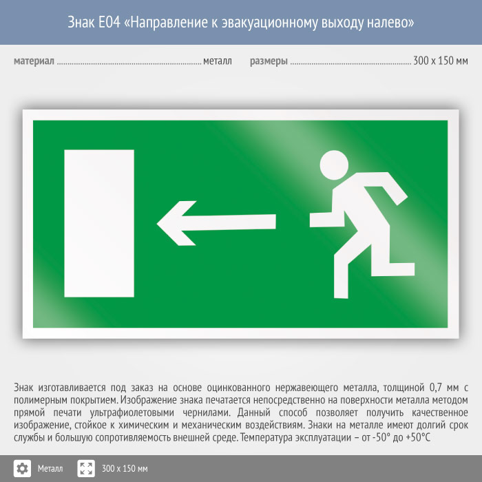 Знак E04 «Направление к эвакуационному выходу налево» (металл, 300х150 мм) в Хотьково купить