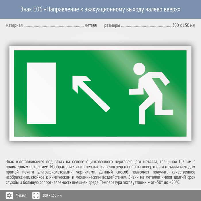 Знак E06 «Направление к эвакуационному выходу налево вверх» (металл, 300х150 мм) в Хотьково купить