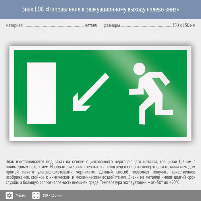 Знак E08 «Направление к эвакуационному выходу налево вниз» (металл, 300х150 мм) в Хотьково купить