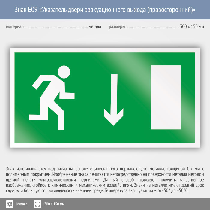 Знак E09 «Указатель двери эвакуационного выхода (правосторонний)» (металл, 300х150 мм) в Хотьково купить