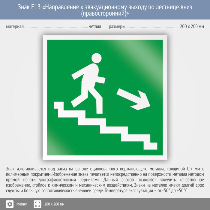 Знак E13 «Направление к эвакуационному выходу по лестнице вниз (правосторонний)» (металл, 200х200 мм) в Хотьково купить