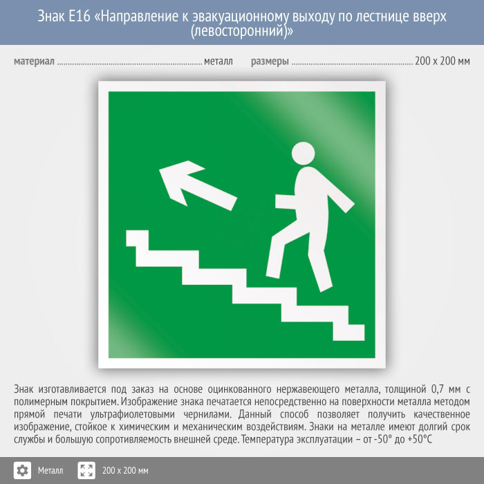 Знак E16 «Направление к эвакуационному выходу по лестнице вверх (левосторонний)» (металл, 200х200 мм) в Хотьково купить