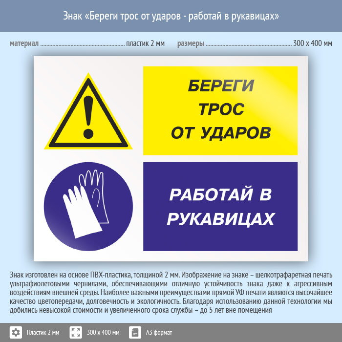 Знак «Береги трос от ударов - работай в рукавицах», КЗ-03 (пластик, 400х300 мм) в Хотьково купить