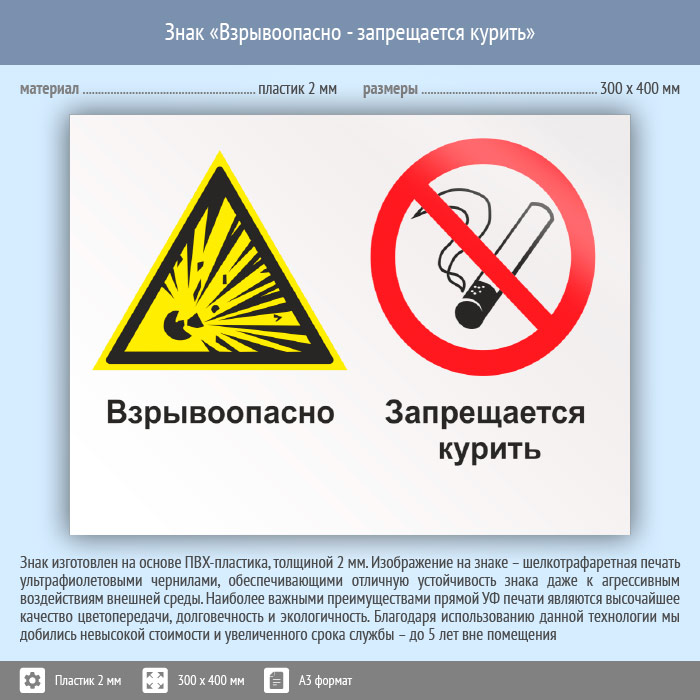 Знак «Взрывоопасно - запрещается курить», КЗ-06 (пластик, 400х300 мм) в Хотьково купить