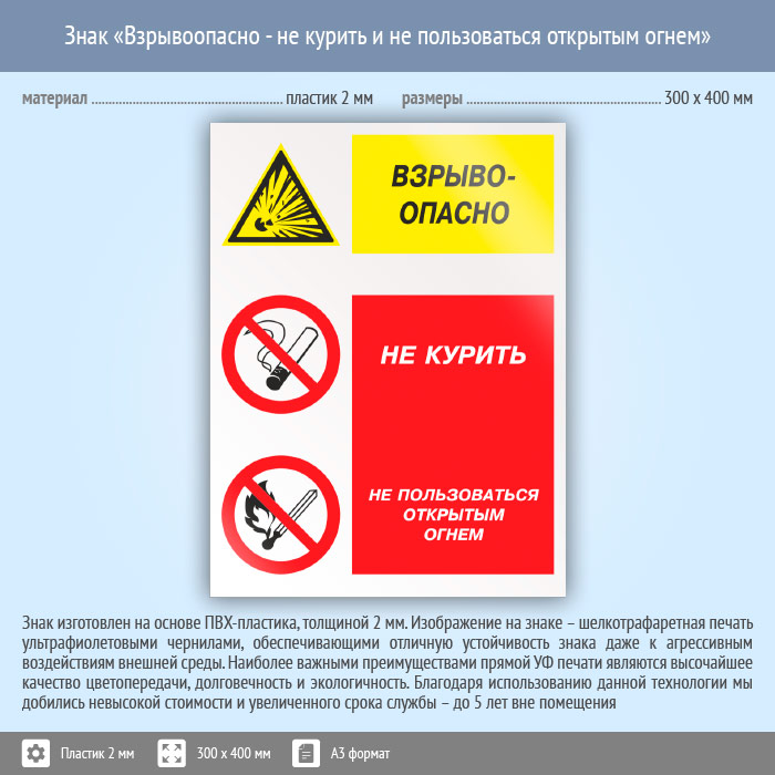 Знак «Взрывоопасно - не курить и не пользоваться открытым огнем», КЗ-08 (пластик, 300х400 мм) в Хотьково купить