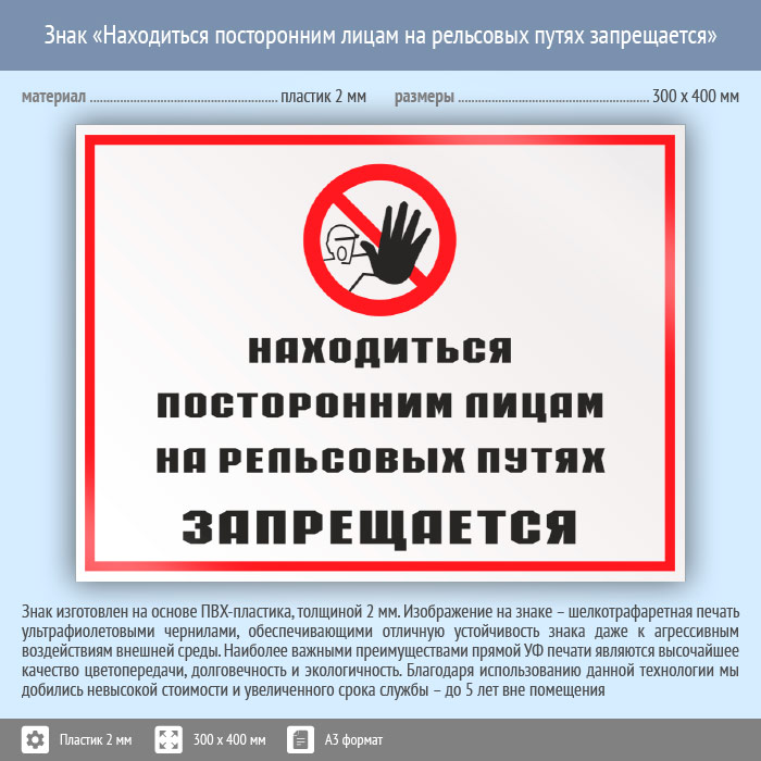 Знак «Находиться посторонним лицам на рельсовых путях запрещается», КЗ-25 (пластик, 400х300 мм) в Хотьково купить
