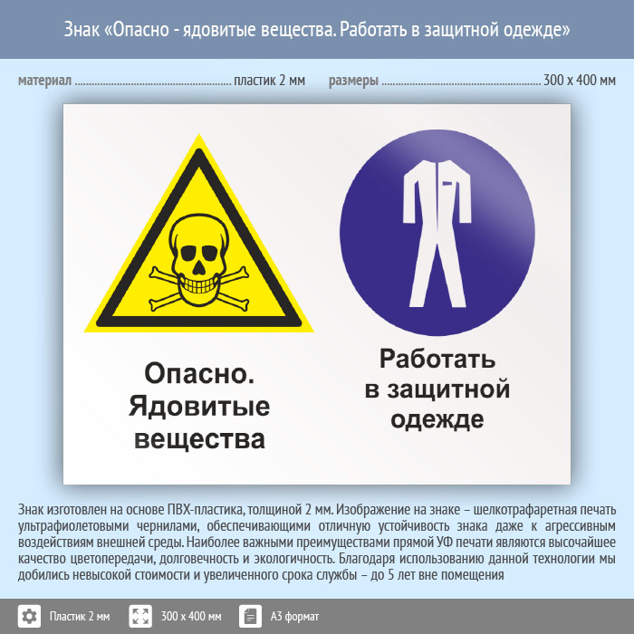 Знак «Опасно - ядовитые вещества. Работать в защитной одежде», КЗ-42 (пластик, 400х300 мм) в Хотьково купить