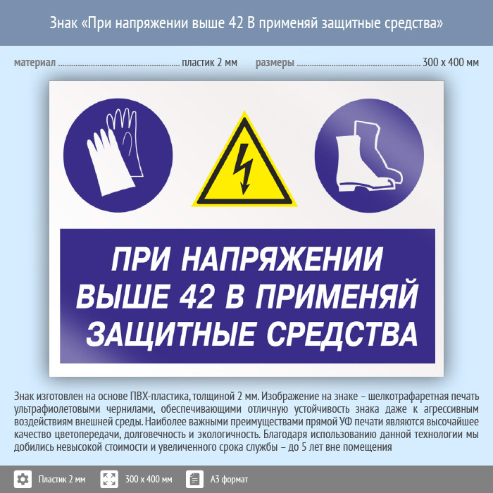 Знак «При напряжении выше 42 В применяй защитные средства», КЗ-72 (пластик, 400х300 мм) в Хотьково купить
