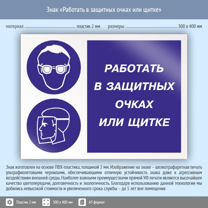 Знак «Работать в защитных очках или щитке», КЗ-80 (пластик, 400х300 мм) в Хотьково купить
