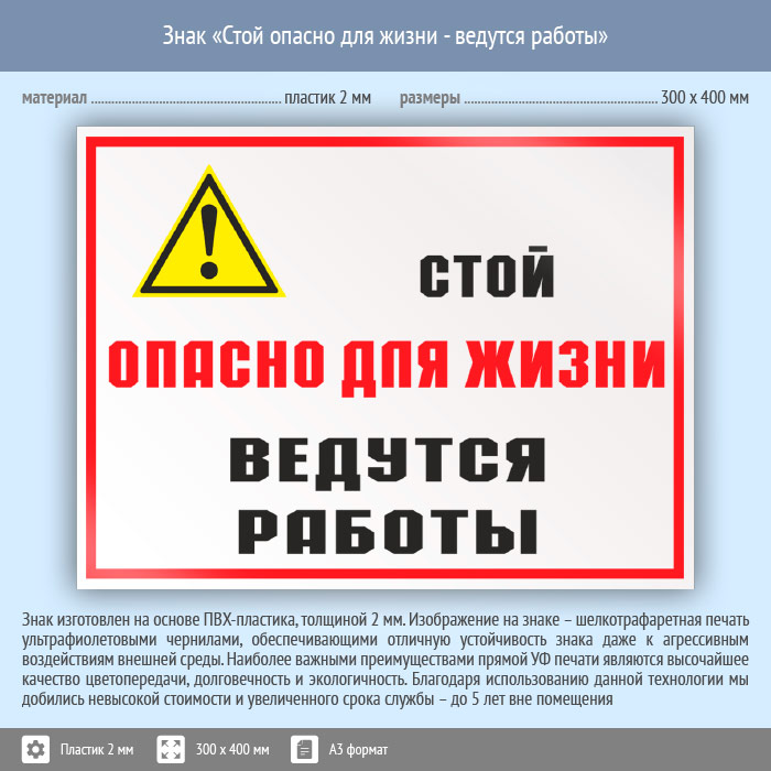 Знак «Стой опасно для жизни - ведутся работы», КЗ-86 (пластик, 400х300 мм) в Хотьково купить