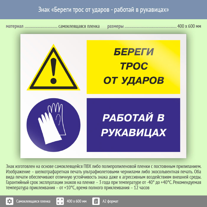 Знак «Береги трос от ударов - работай в рукавицах», КЗ-03 (пленка, 600х400 мм) в Хотьково купить
