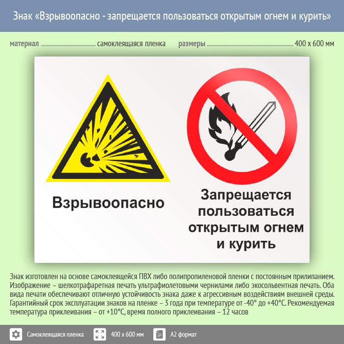 Знак «Взрывоопасно - запрещается пользоваться открытым огнем и курить», КЗ-07 (пленка, 600х400 мм) в Хотьково купить