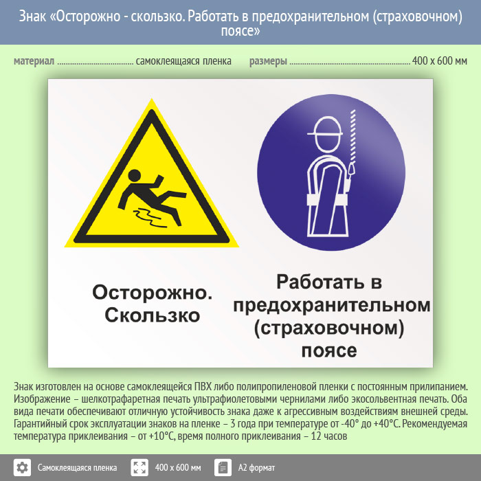 Знак «Осторожно - скользко. Работать в предохранительном (страховочном) поясе», КЗ-58 (пленка, 600х400 мм) в Хотьково купить