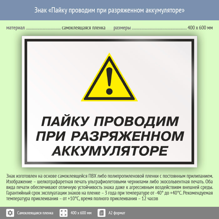 Знак «Пайку проводим при разряженном аккумуляторе», КЗ-62 (пленка, 600х400 мм) в Хотьково купить