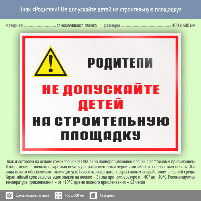 Знак «Родители! Не допускайте детей на строительную площадку», КЗ-84 (пленка, 600х400 мм) в Хотьково купить
