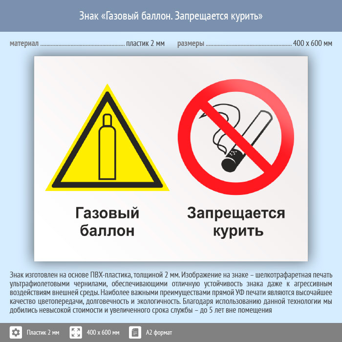 Знак «Газовый баллон. Запрещается курить», КЗ-18 (пластик, 600х400 мм) в Хотьково купить