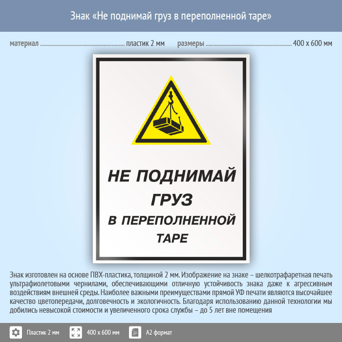 Знак «Не поднимай груз в переполненной таре», КЗ-26 (пластик, 400х600 мм) в Хотьково купить