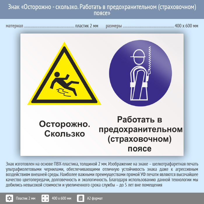 Знак «Осторожно - скользко. Работать в предохранительном (страховочном) поясе», КЗ-58 (пластик, 600х400 мм) в Хотьково купить