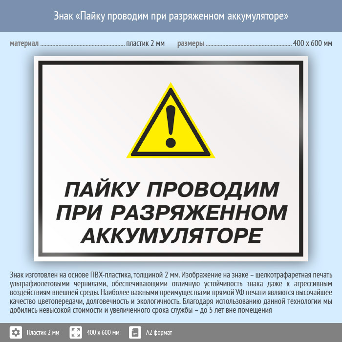 Знак «Пайку проводим при разряженном аккумуляторе», КЗ-62 (пластик, 600х400 мм) в Хотьково купить