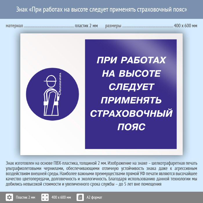 Знак «При работах на высоте следует применять страховочный пояс», КЗ-75 (пластик, 600х400 мм) в Хотьково купить