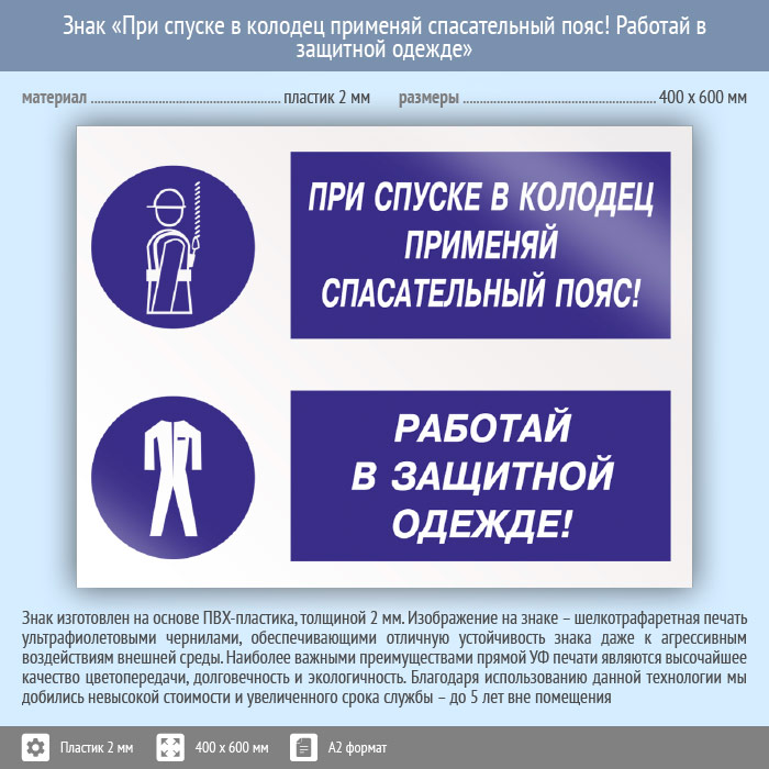 Знак «При спуске в колодец применяй спасательный пояс! Работай в защитной одежде», КЗ-76 (пластик, 600х400 мм) в Хотьково купить
