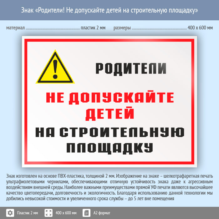 Знак «Родители! Не допускайте детей на строительную площадку», КЗ-84 (пластик, 600х400 мм) в Хотьково купить