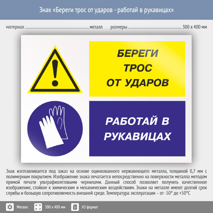 Знак «Береги трос от ударов - работай в рукавицах», КЗ-03 (металл, 400х300 мм) в Хотьково купить
