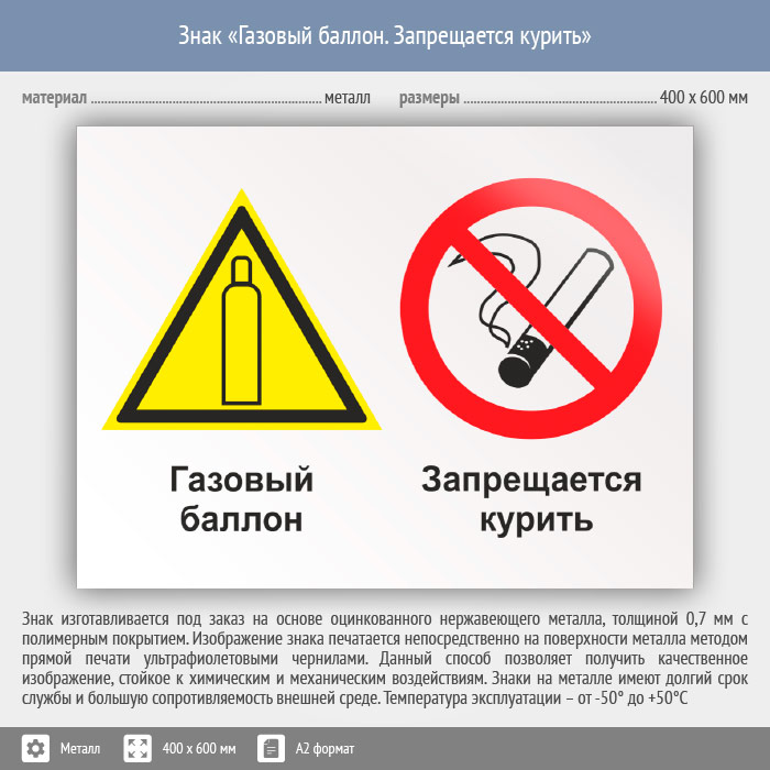 Знак «Газовый баллон. Запрещается курить», КЗ-18 (металл, 600х400 мм) в Хотьково купить