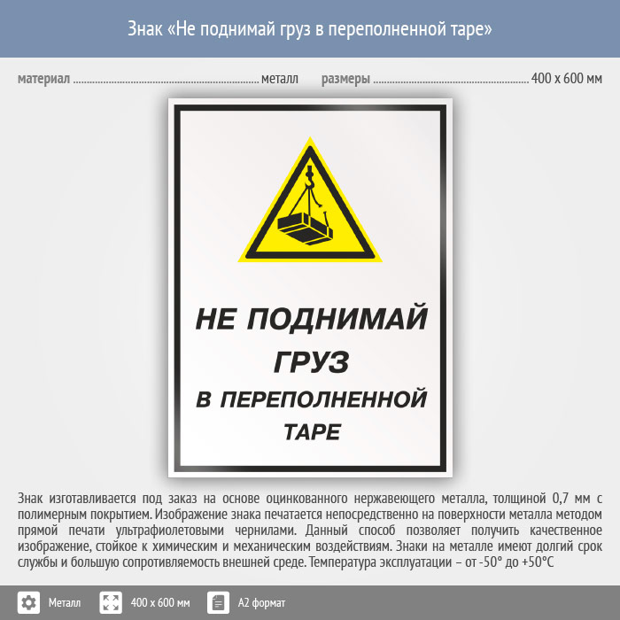 Знак «Не поднимай груз в переполненной таре», КЗ-26 (металл, 400х600 мм) в Хотьково купить