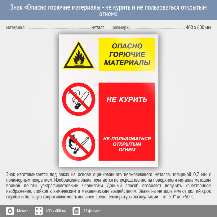 Знак «Опасно горючие материалы - не курить и не пользоваться открытым огнем», КЗ-45 (металл, 400х600 мм) в Хотьково купить
