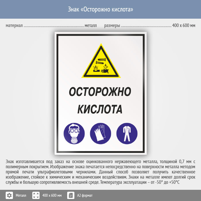 Знак «Осторожно кислота», КЗ-61 (металл, 400х600 мм) в Хотьково купить