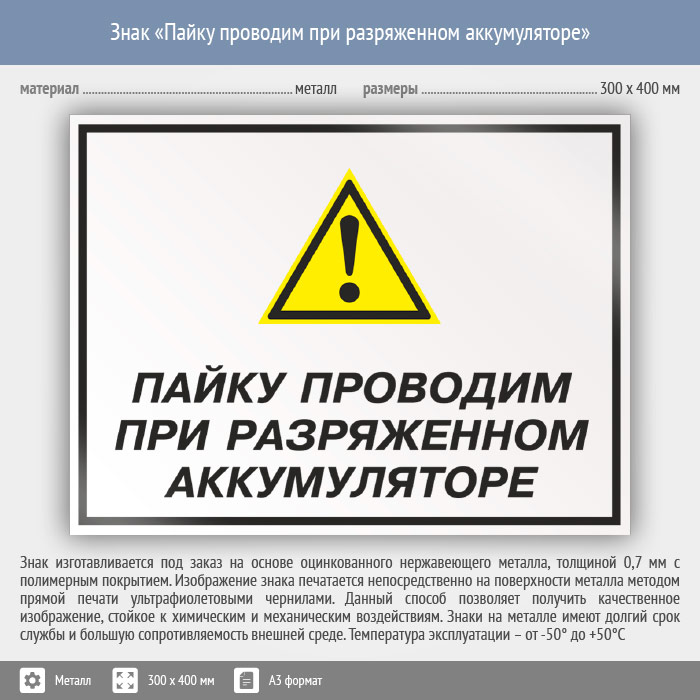 Знак «Пайку проводим при разряженном аккумуляторе», КЗ-62 (металл, 400х300 мм) в Хотьково купить