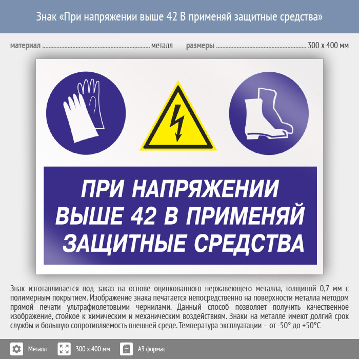 Знак «При напряжении выше 42 В применяй защитные средства», КЗ-72 (металл, 400х300 мм) в Хотьково купить