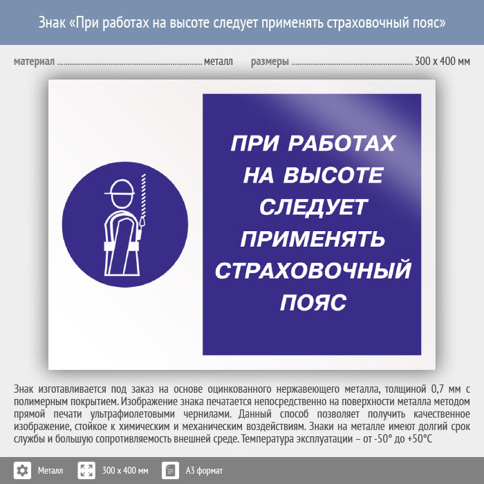 Знак «При работах на высоте следует применять страховочный пояс», КЗ-75 (металл, 400х300 мм) в Хотьково купить