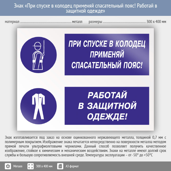 Знак «При спуске в колодец применяй спасательный пояс! Работай в защитной одежде», КЗ-76 (металл, 400х300 мм) в Хотьково купить