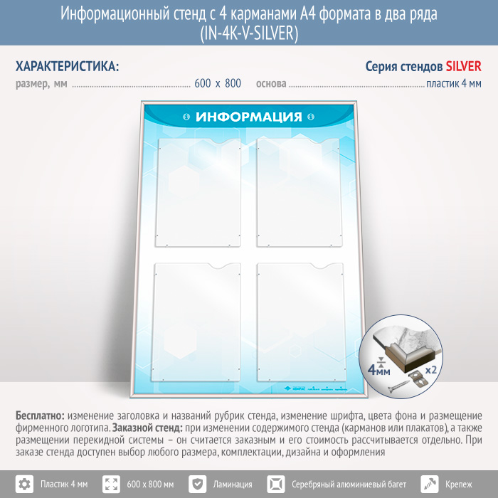 Информационный стенд с 4 карманами А4 формата в два ряда (IN-4K-V-SILVER) в Хотьково купить