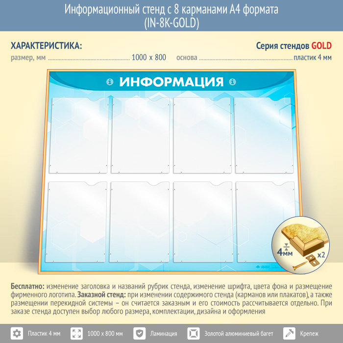 Информационный стенд с 8 карманами А4 формата (IN-8K-GOLD) в Хотьково купить