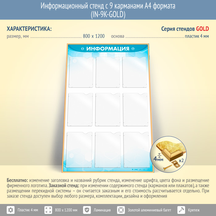 Информационный стенд с 9 карманами А4 формата (IN-9K-GOLD) в Хотьково купить