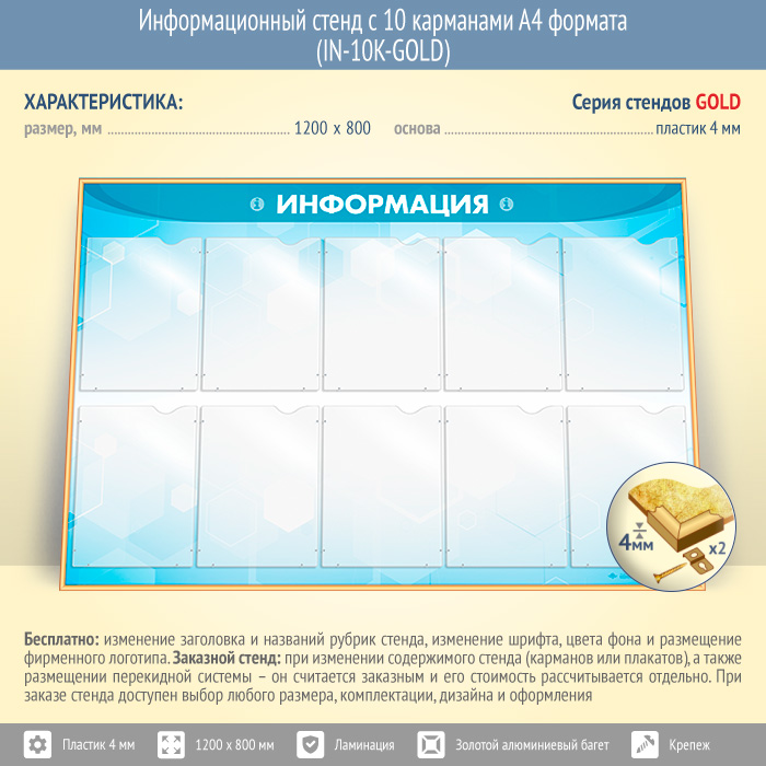 Информационный стенд с 10 карманами А4 формата (IN-10K-GOLD) в Хотьково купить