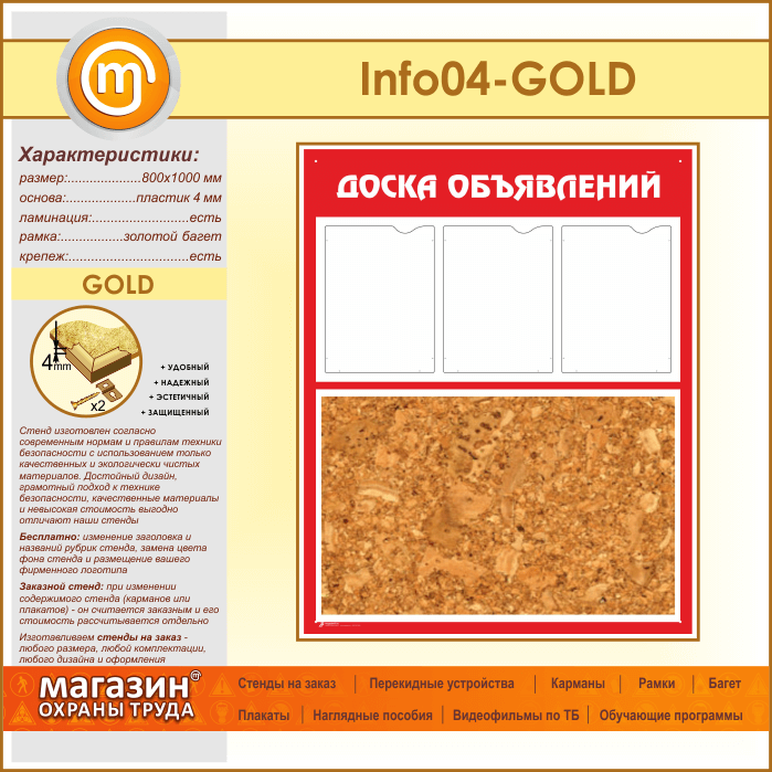 Стенд «Доска объявлений» с пробковым полотном и 3 карманами А4 формата (IN-04-GOLD) в Хотьково купить