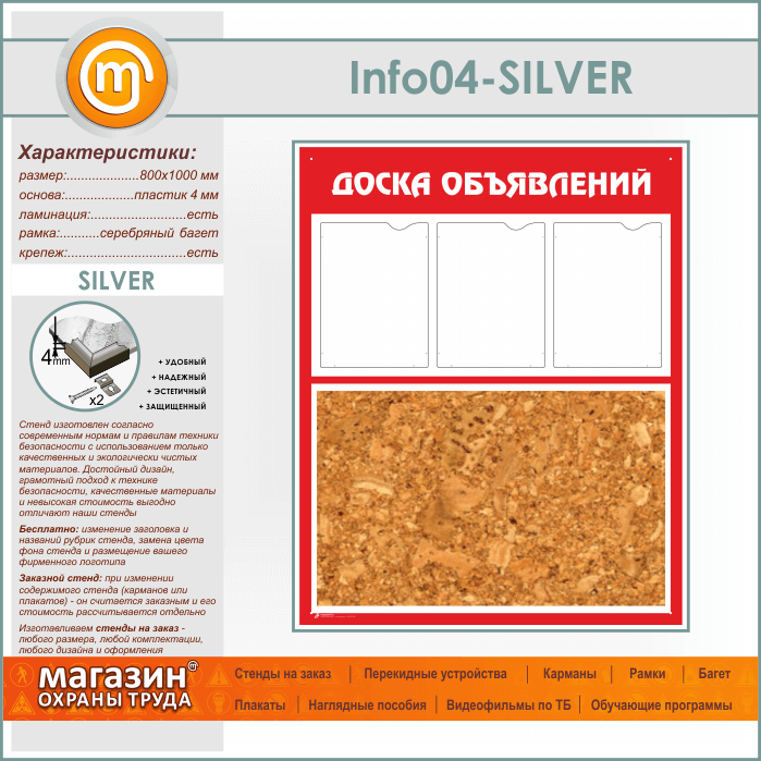 Стенд «Доска объявлений» с пробковым полотном и 3 карманами А4 формата (IN-04-SILVER) в Хотьково купить