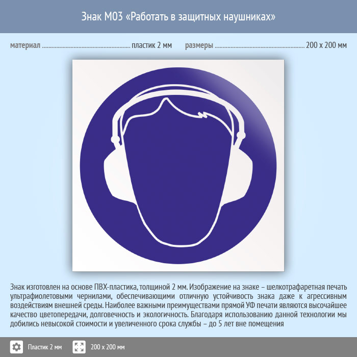 Знак M03 «Работать в защитных наушниках» (пластик, 200х200 мм) в Хотьково купить