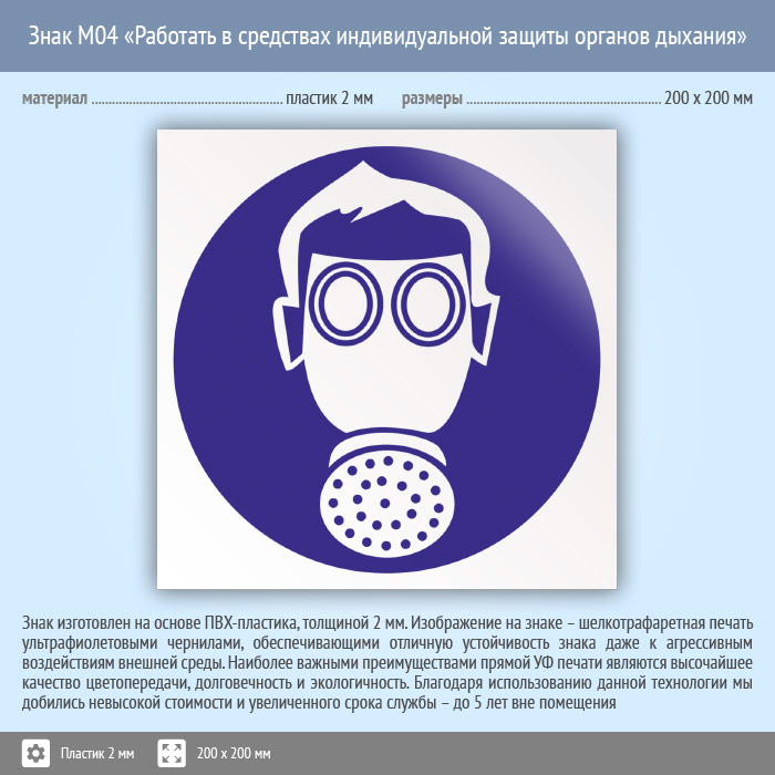 Знак M04 «Работать в средствах индивидуальной защиты органов дыхания» (пластик, 200х200 мм) в Хотьково купить