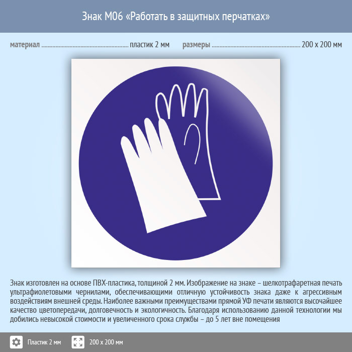 Знак M06 «Работать в защитных перчатках» (пластик, 200х200 мм) в Хотьково купить