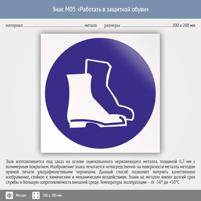 Знак M05 «Работать в защитной обуви» (металл, 200х200 мм) в Хотьково купить