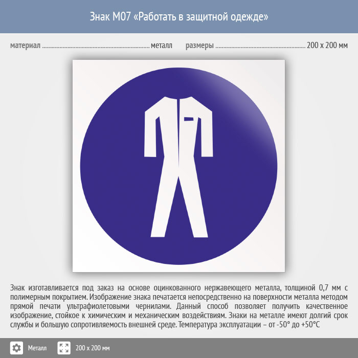 Знак M07 «Работать в защитной одежде» (металл, 200х200 мм) в Хотьково купить