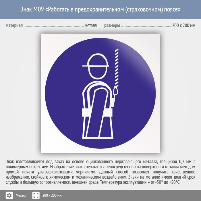 Знак M09 «Работать в предохранительном (страховочном) поясе» (металл, 200х200 мм) в Хотьково купить