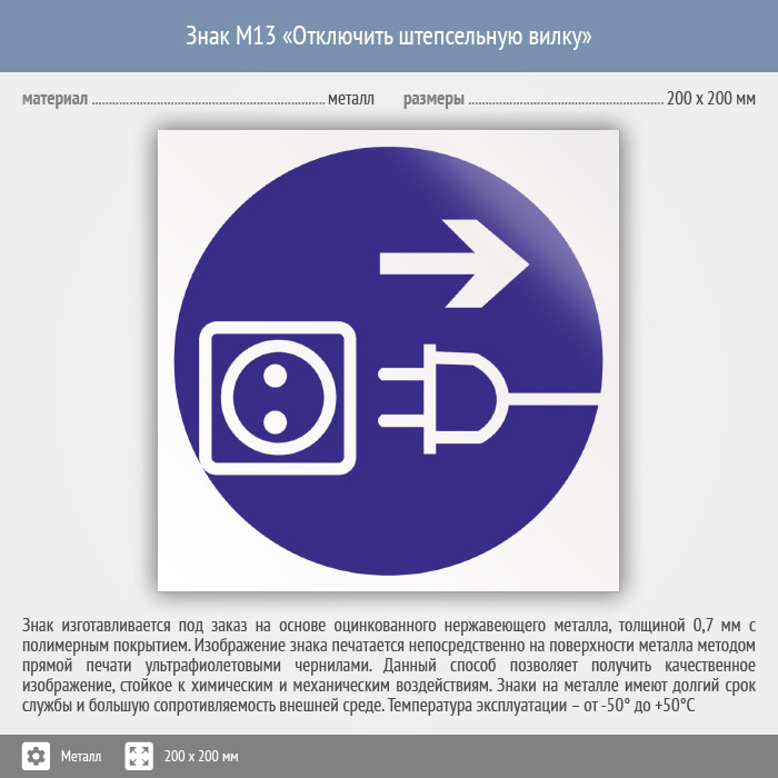 Знак M13 «Отключить штепсельную вилку» (металл, 200х200 мм) в Хотьково купить