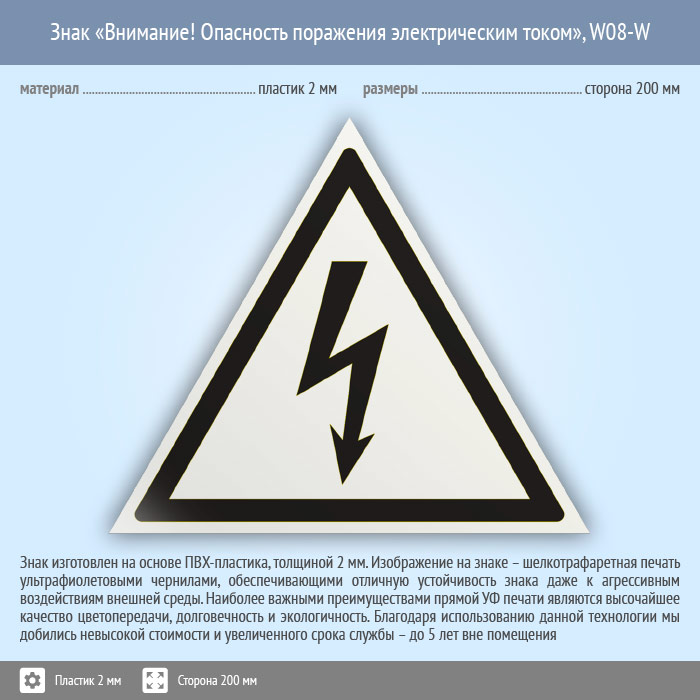 Знак W08-W «Внимание! опасность поражения электрическим током» (белый, пластик, сторона 200 мм) в Хотьково купить