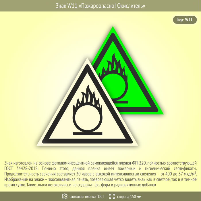 Знак W11 «Пожароопасно! окислитель» (фотолюминесцентная пленка ГОСТ 34428-2018, сторона 150 мм) в Хотьково купить